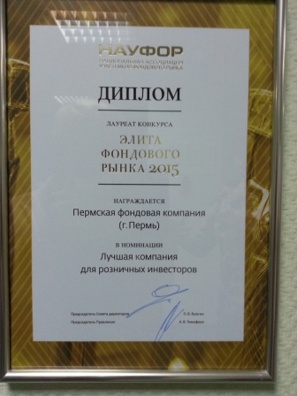 Пермская фондовая компания в очередной раз стала лауреатом ежегодного конкурса «Элита фондового рынка 2015», организованного Национальной ассоциацией участников фондового рынка (НАУФОР), получив диплом в номинации: «Лучшая компания для розничных инвесторов».